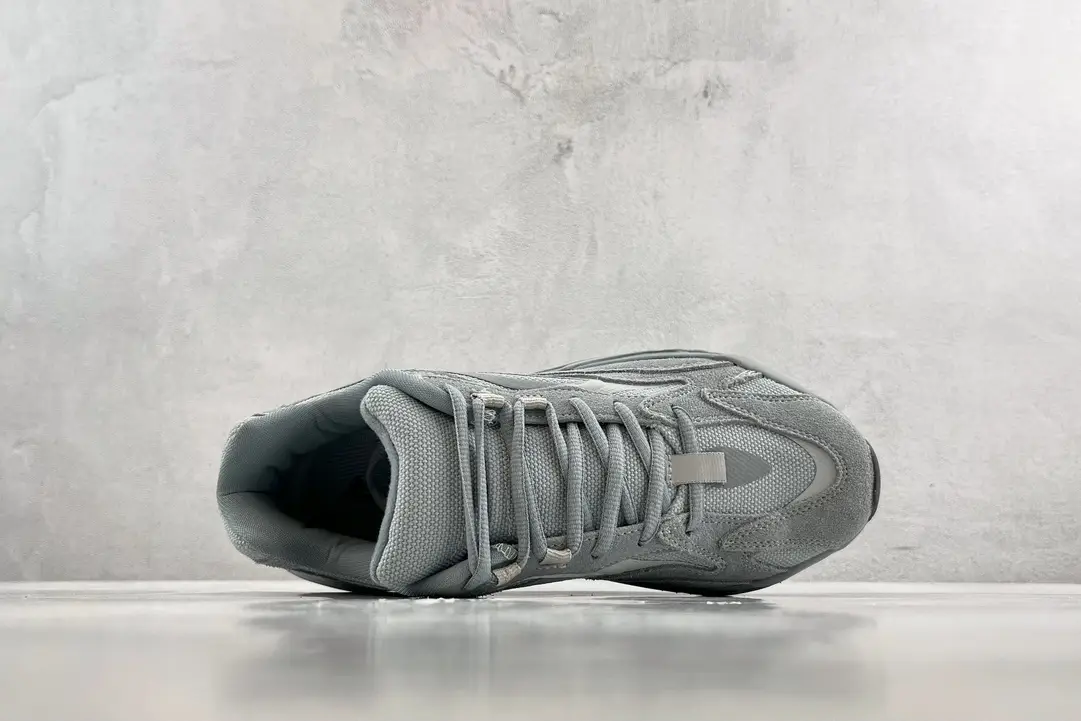 The adidas Yeezy Boost 700 V2 Hospital Blue features a Hospital Blue canvas and suede upper, with all materials taking on light blue tones that can appear almost grayish. From there, a bulky midsole of the V2 takes on a streamlined, sporty appearance atop a black outsole and a full-length Boost midsole complete the design.