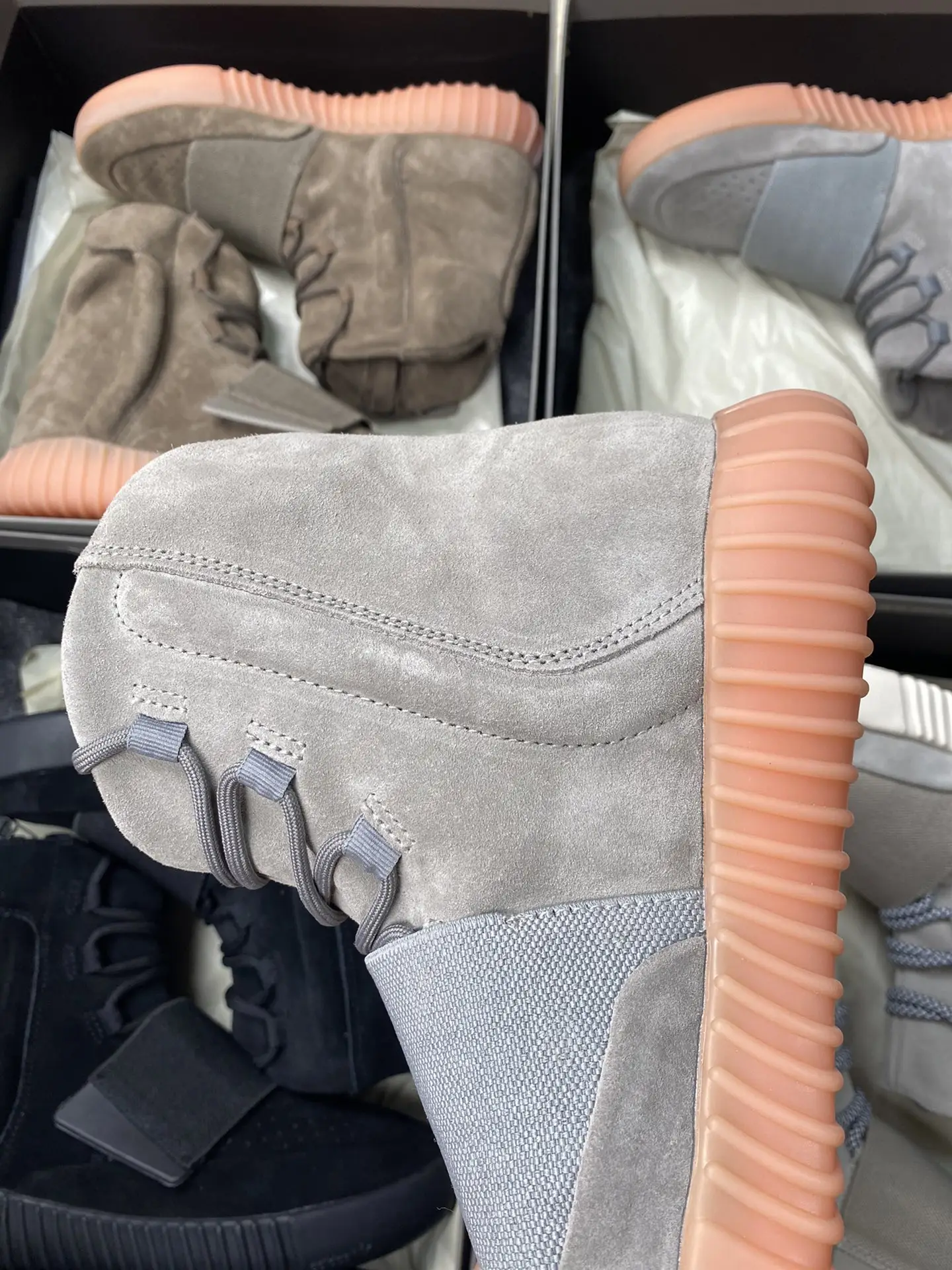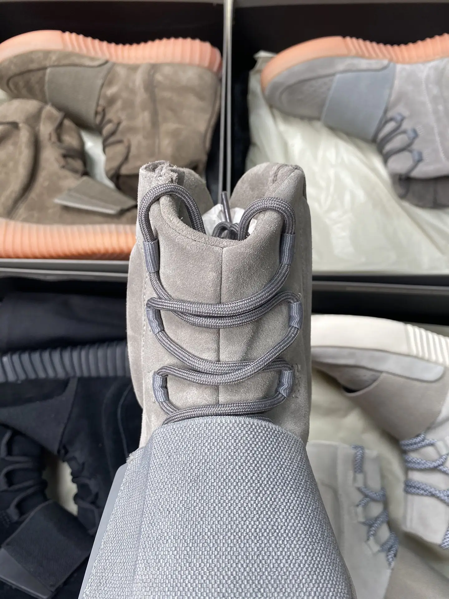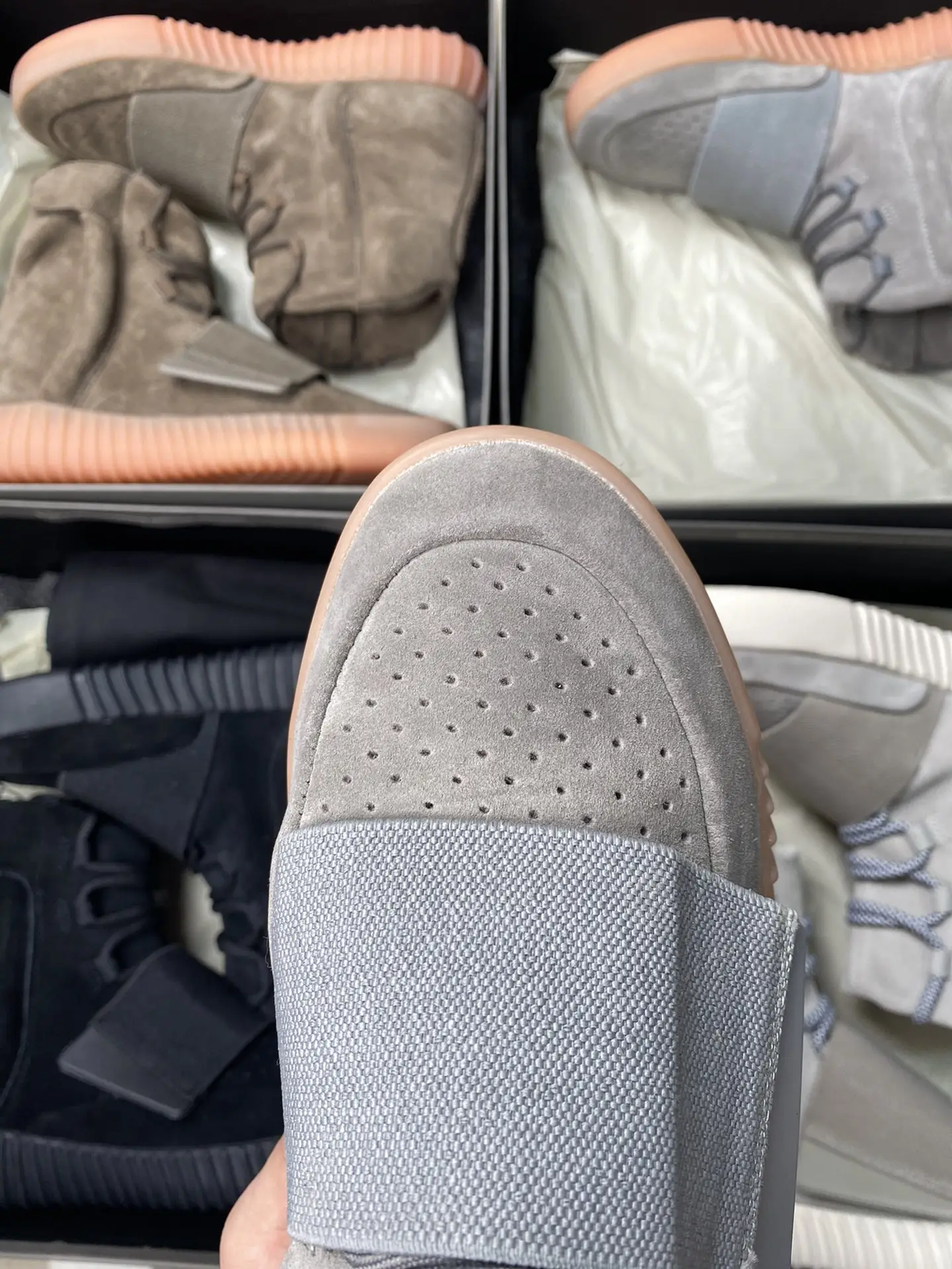 The Light Grey colorway embodies sophisticated minimalism through its expertly curated material palette. Premium light grey suede wraps the entire upper, delivering a soft, luxurious hand feel that improves with age. The distinctive ankle strap—a Yeezy signature carried over from the Nike Air Yeezy lineage—secures with a circular Velcro closure system that’s both functional and iconic. Tonal grey laces thread through hidden eyelets, maintaining the clean aesthetic. The padded collar and tongue create a comfortable high-top silhouette that sits perfectly on the ankle. When lights dim, the translucent glow-in-the-dark outsole activates, revealing the subtle magic that earned this colorway its “Glow” nickname.
