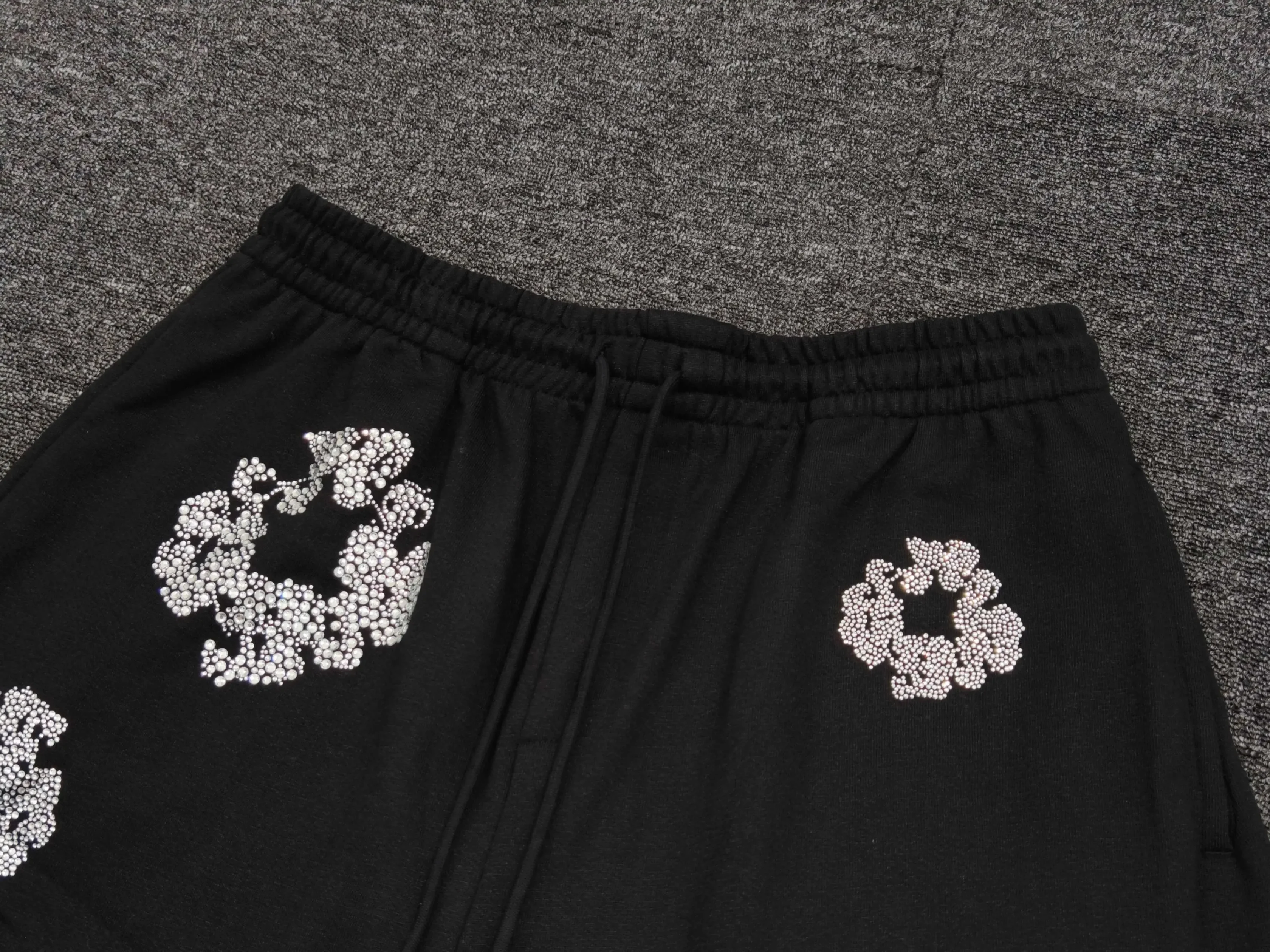 The original version of the shorts is very heavy, and the fabric of the shorts co branded with Swarovski is actually a blend that is very difficult to mix and very comfortable. The skin friendly gray is starry sky gray, which is not a pure color and must be woven and dyed to achieve the original fabric effect. The original version uses top-quality Austrian diamonds, which are very expensive in cost. Considering the cost-effectiveness, we have used relatively low-cost Czech diamonds to ensure that the cutting surface, light refraction, and brightness of the diamonds are infinitely close to the original customized co branded main logo/QR code anti-counterfeiting label