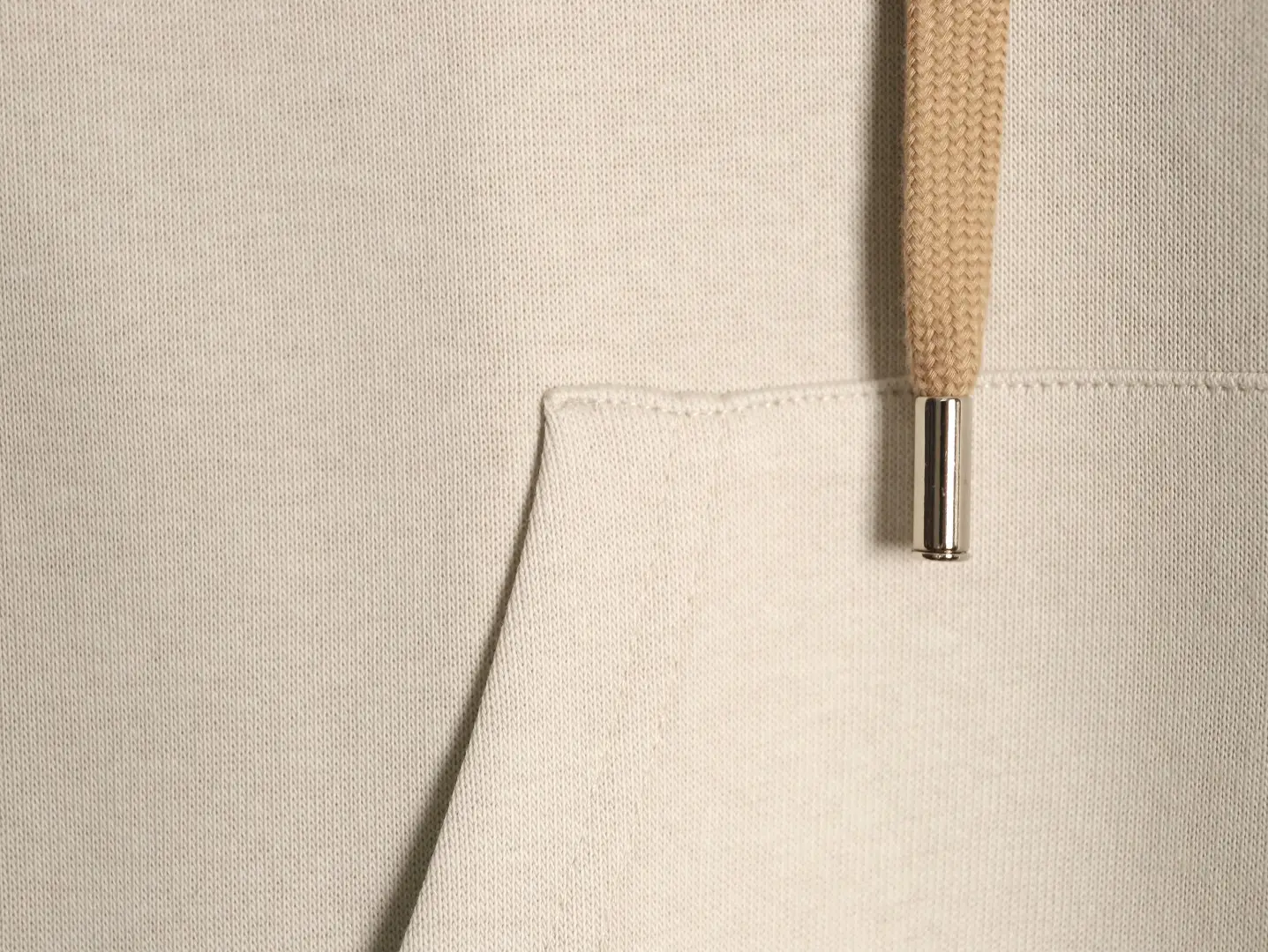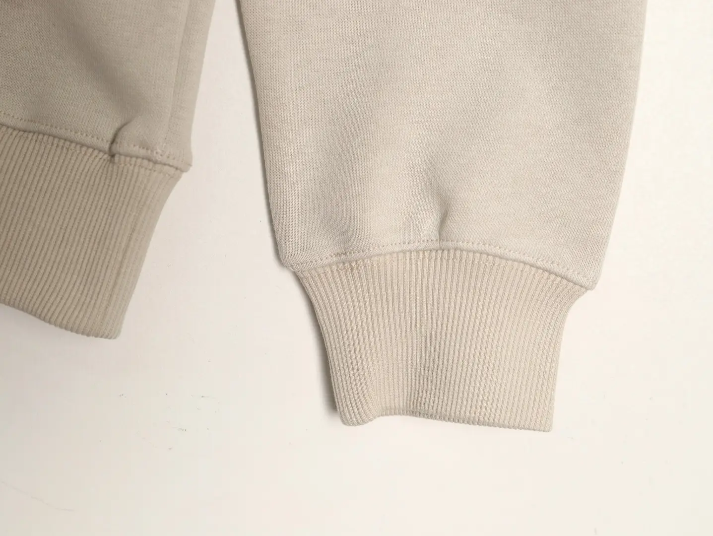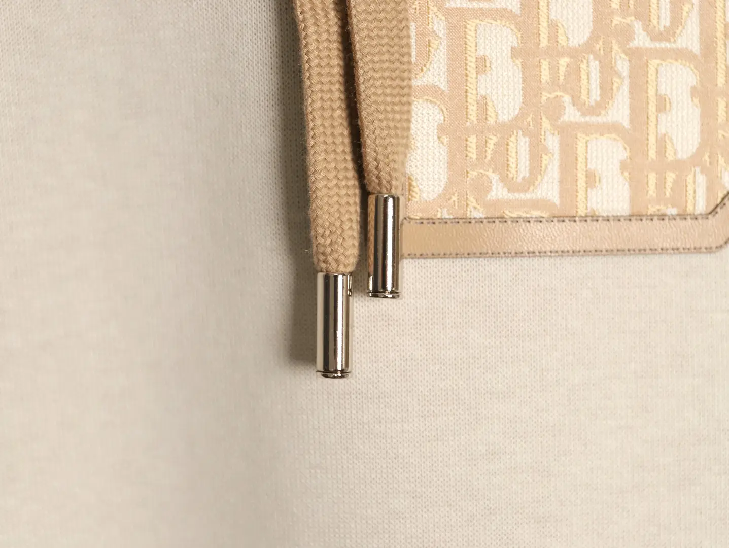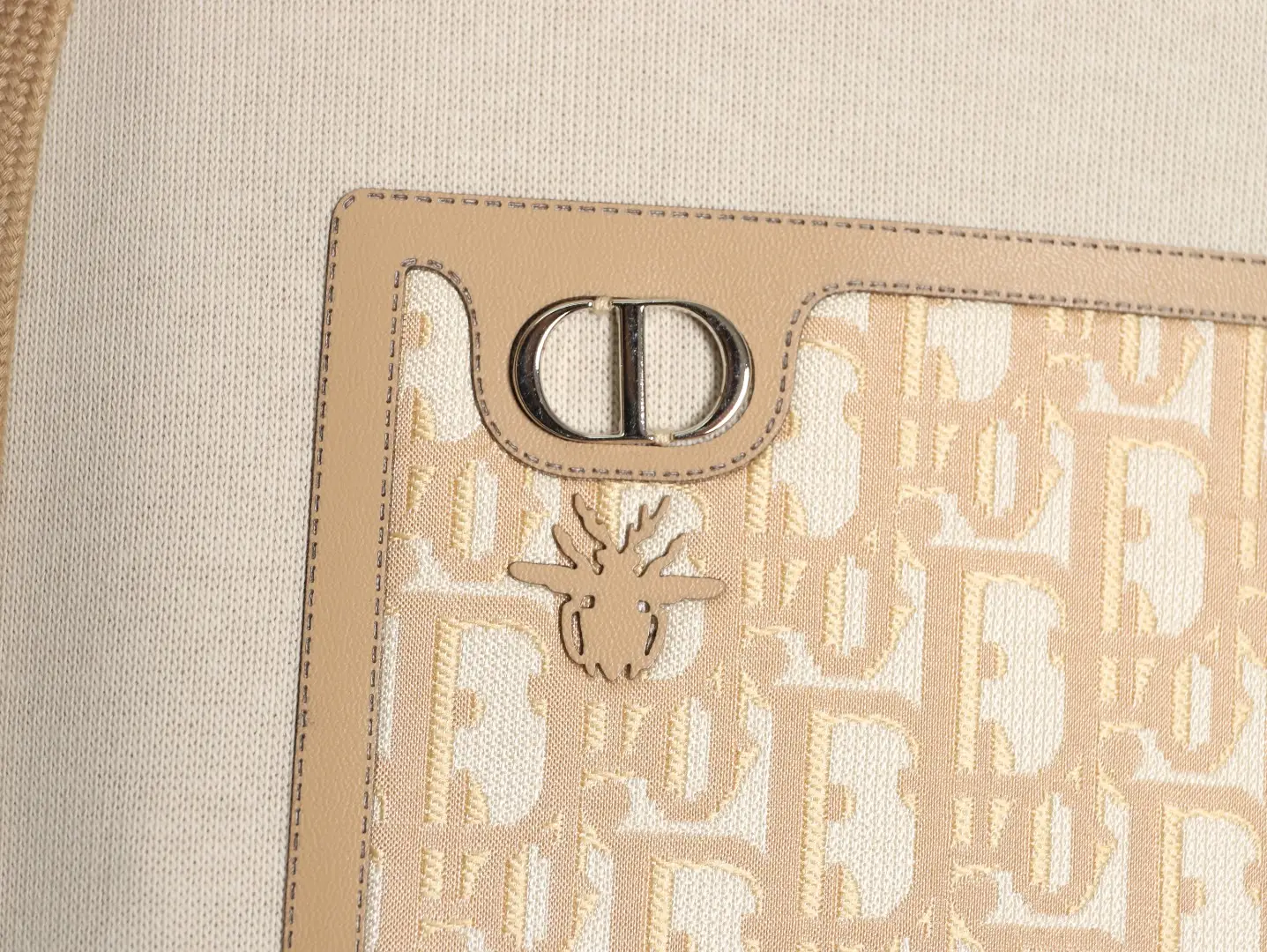 The IOR hooded sweatshirt is made of 86% cotton blend fabric, which is soft, breathable, and crisp. The front shoulder is cut in a three-dimensional manner, giving the body freedom. The thick cotton lining wraps warmth, and the oversized three-dimensional slanted pocket design combines the casual posture of inserting pockets with the security of carrying items. The ribbed cuffs and hem ensure better fit and warmth. The most eye-catching feature is its carefully designed irregular slanted bag, made of high-quality leather, which contrasts with Dior’s iconic fabric in texture and showcases its unique stitching craftsmanship. Becoming the visual focal point of the entire garment, the pocket is hand sewn with custom CD hardware accessories, exuding a strong sense of delicacy.