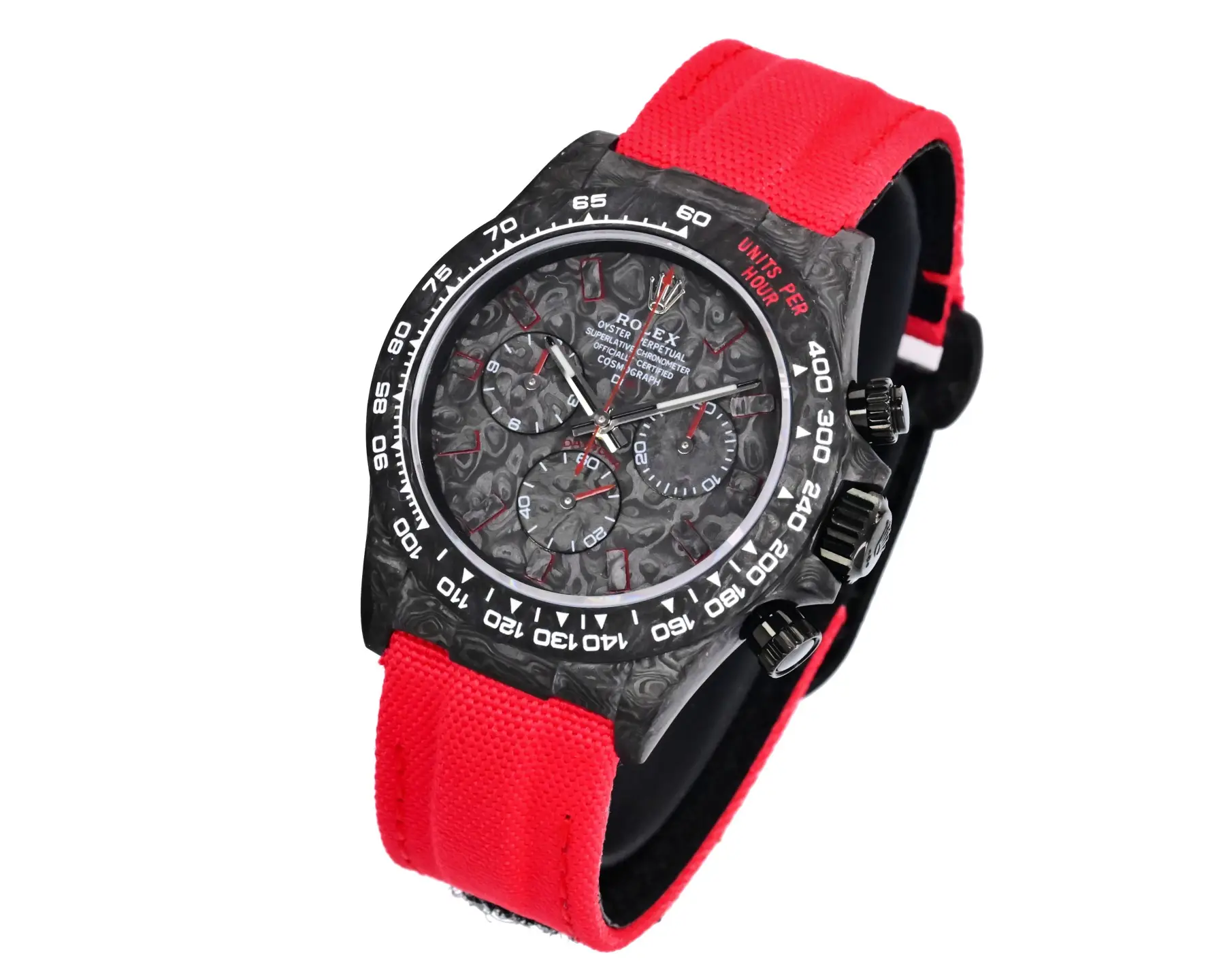 It has a hard exterior. And each watch has a unique carbon fiber patterned material. The size of the watch case is 40X12 4, which matches the original. The factory’s strength creates a unique style of carbon fiber casting. Exclusive to the market, the entire shell, rim, and bottom cover are made of high composite carbon fiber and super strong luminous powder. The details have been hand chamfered and polished. The texture is extraordinary. The strap buckle is made of artificial fiber woven strap, which is breathable, comfortable, and soft in texture. The movement adopts the latest precise and mature 4130 movement from Shanghai, perfectly realizing the king of powerful functions and cost-effectiveness!!!