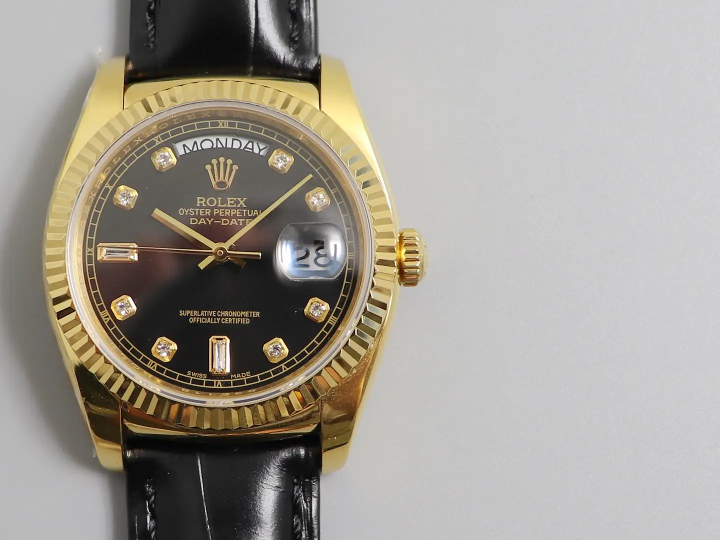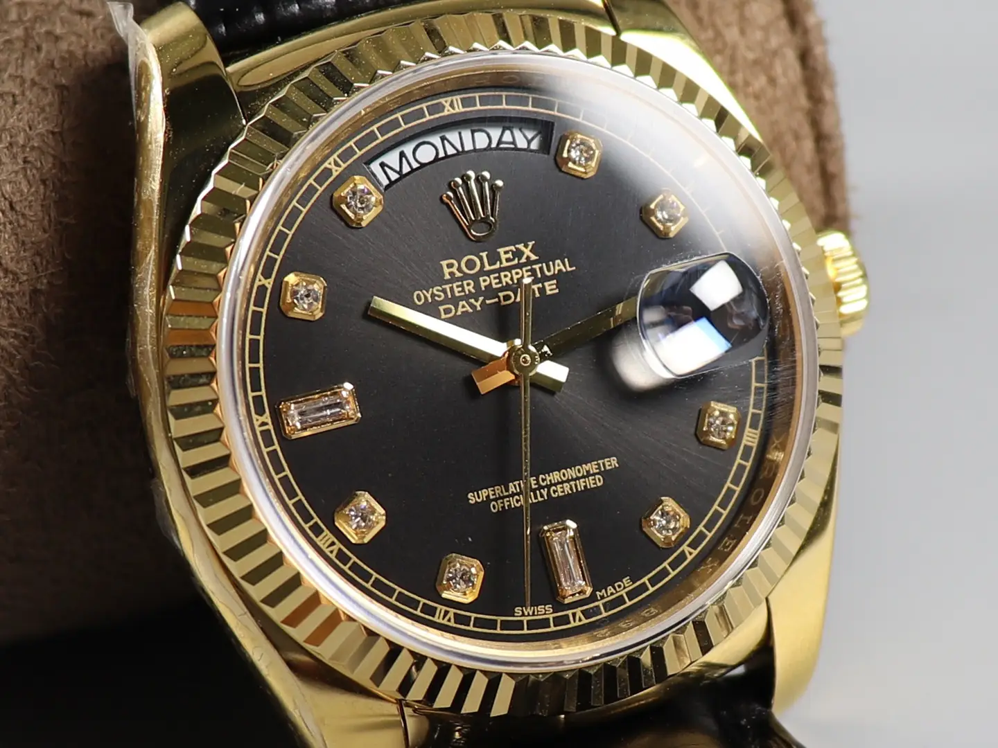 The new Rolex day 36mm neutral size calendar series is available in small quantities and features a replica crocodile leather strap, original clasp, and dial made of imported diamonds from the United States. It accurately depicts everything in its original state! Each watch comes with a counter factory label! To ensure consistency with the official