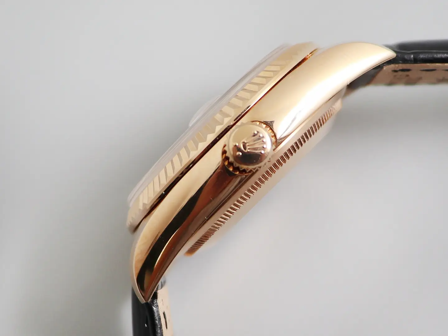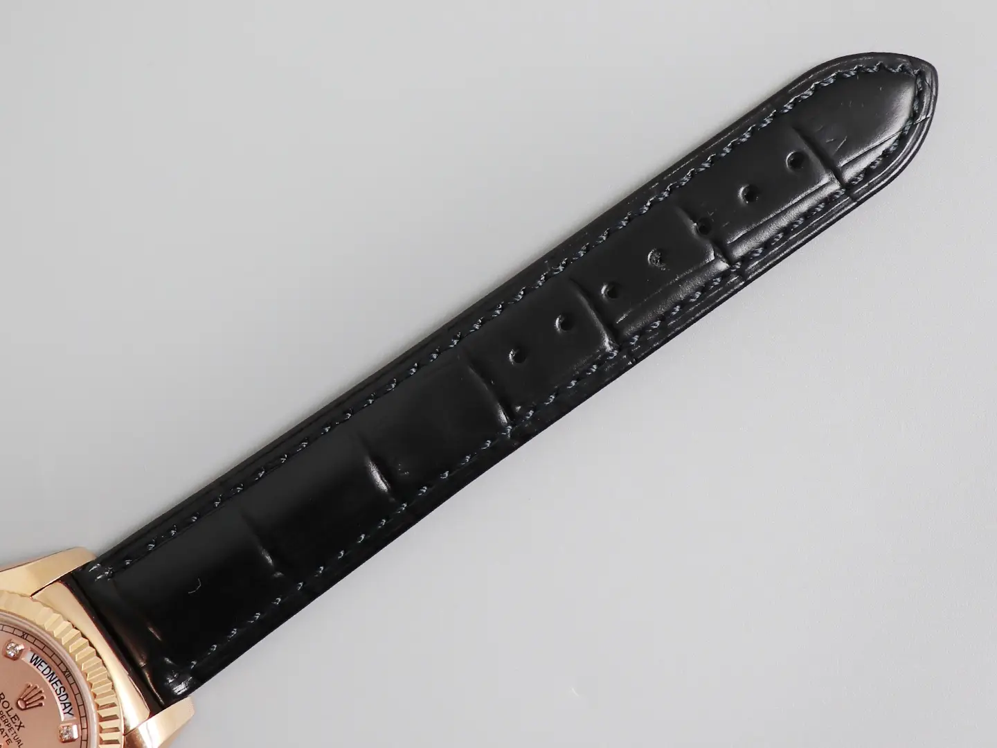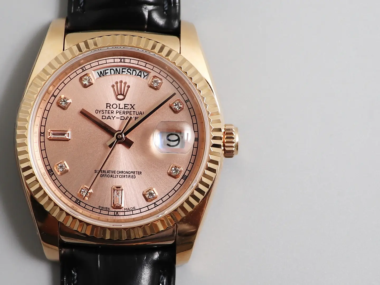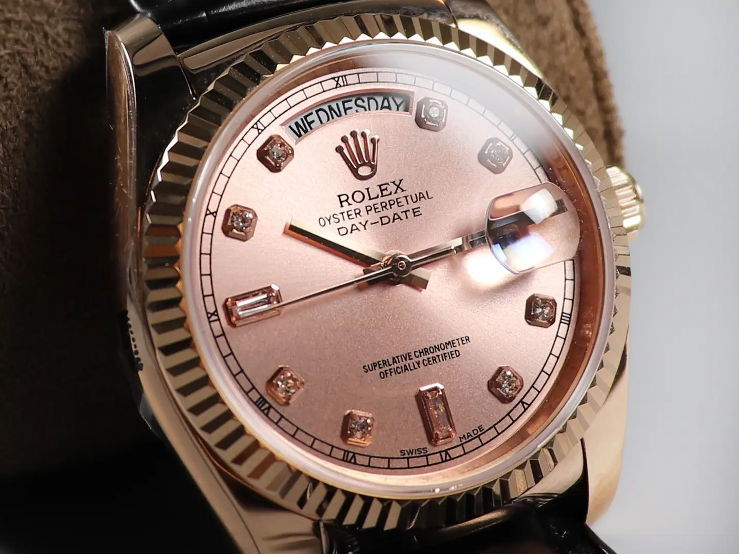 Rolex Day-Date 36 Everose Gold Diamond Pink Dial Black Leather Watch