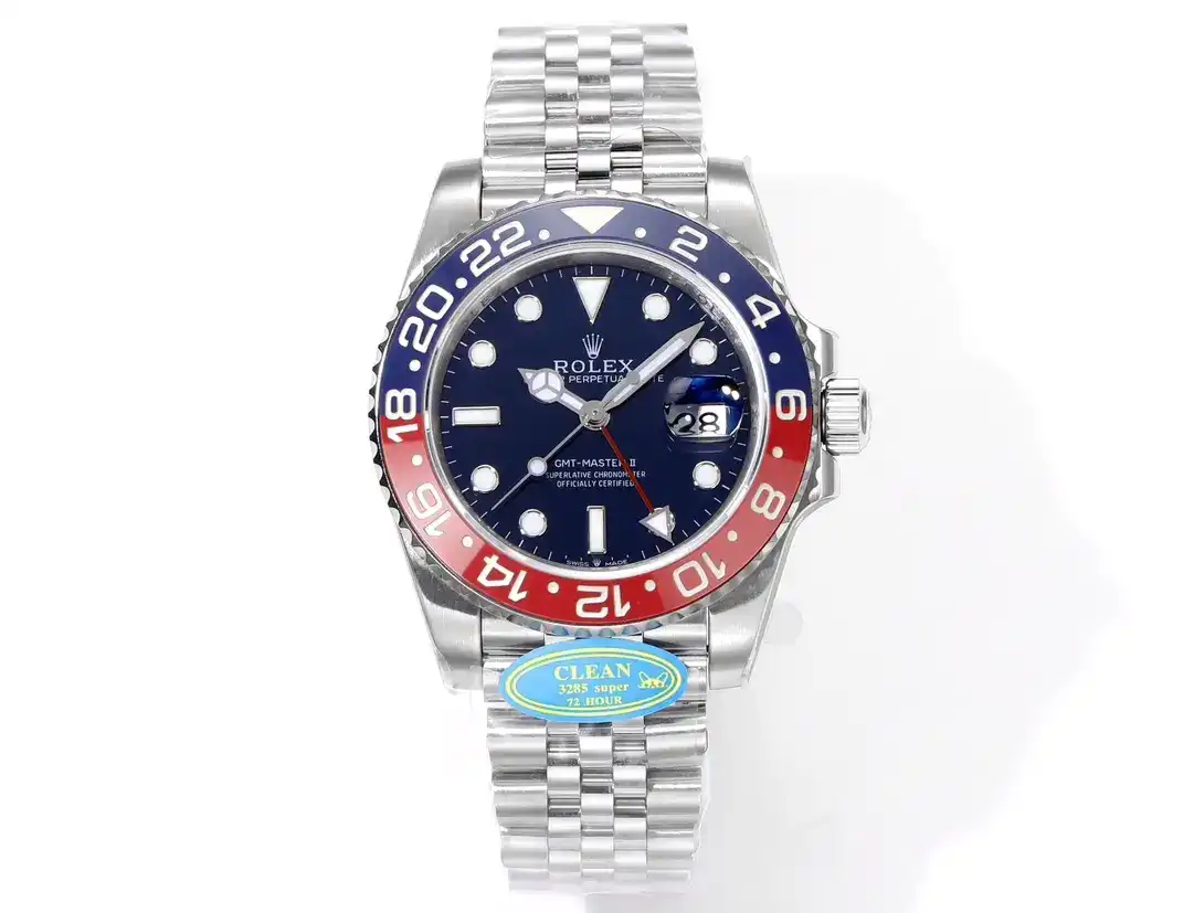 The fake Rolex GMT Master II replica (ref. 126710BLRO-0003) pairs the iconic Pepsi red-blue ceramic bezel with a rich blue sunray dial and five-piece Jubilee bracelet. Powered by a one-to-one Calibre 3285 with 70-hour power reserve and independent GMT hand adjustment, this is the dual-timezone replica built for travellers. Order yours now at RepsGoat with worldwide shipping.