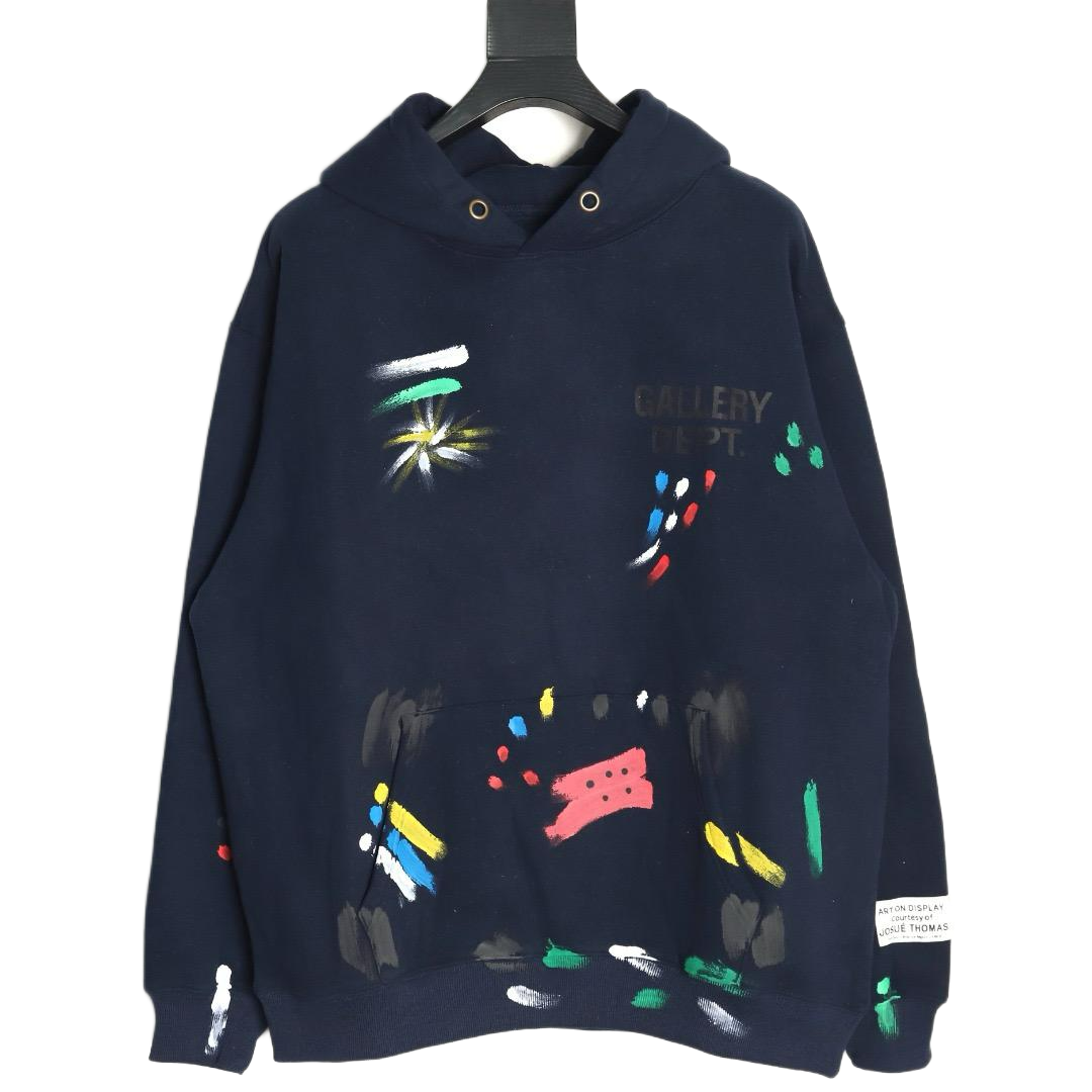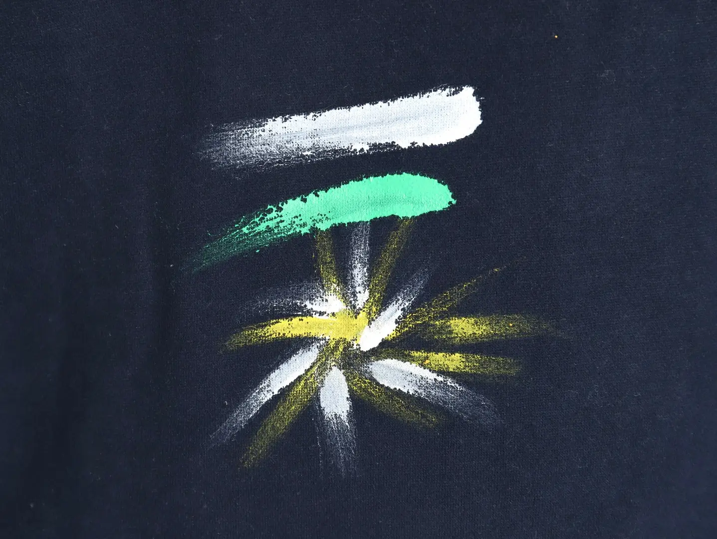 Bottom 8 grams, 420 grams, pure cotton three line fleece hoodie with 21 double yarns, 2 * 2 threads, horizontal cutting fabric, same body material, same cylinder to ensure colorless yarn, large body, same rib, same cylinder yarn, color weaving. The front printing achieves different peeling and depth effects during the process of stone grinding and heavy washing, creating a visual effect of ink splashing and painting. The slurry is made of environmentally friendly water-based powder slurry and mixed in proportion. Imported slurry is hand drawn and attached to the fabric, with strong water washing resistance and high water washing fastness. All colors of the entire garment are aligned with the original color. The quantity of colors is high, which requires high technical requirements for workers and time-consuming printing. 17 sets of flower board water-based ink are used to cover the finished product printing. One piece of clothing needs to be printed more than 30 times. Each process is compact and circular. Interlocking with strict requirements for process technology and high quality, the finished products are naturally beautiful when shipped