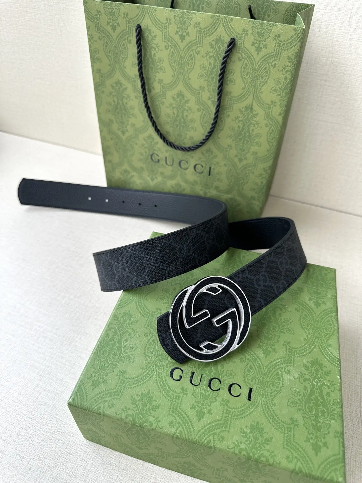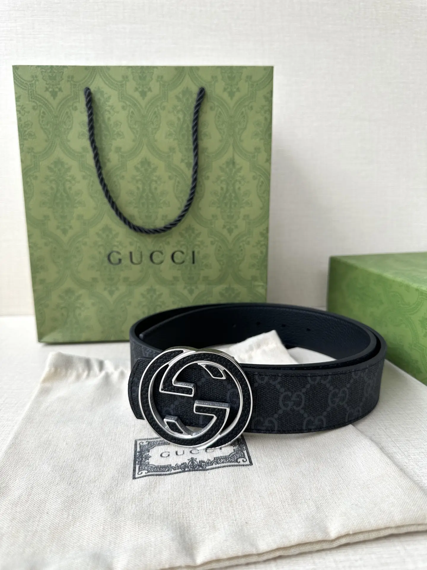 Classic elements. This belt is crafted with cowhide craftsmanship, cleverly embellished with interlocking double G buckles, and paired with embossed cowhide. This belt is crafted with grey cowhide on the front and black cowhide on the back, providing more styling options.