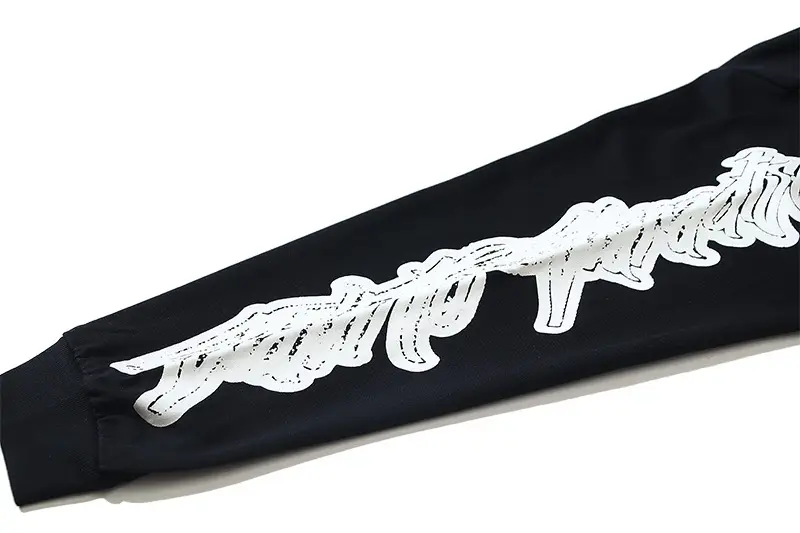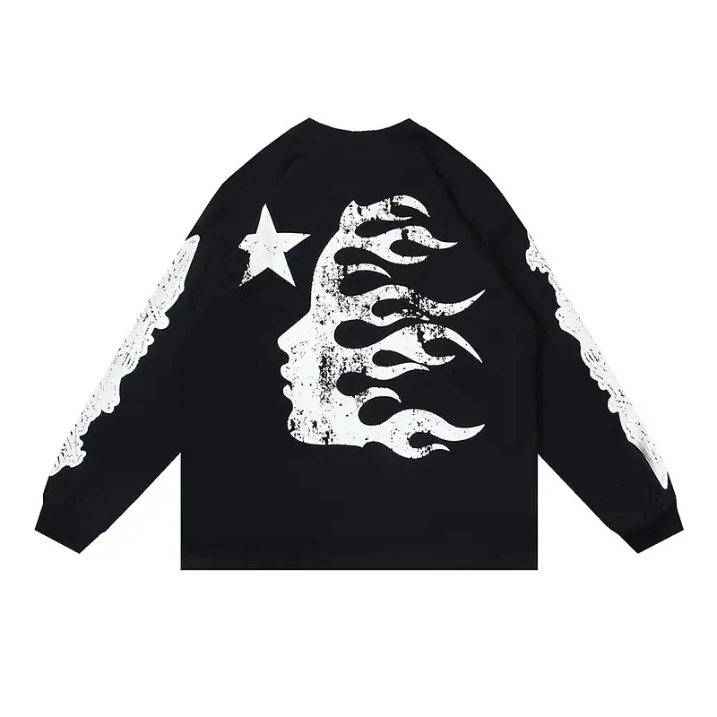 Like flames, graffiti on the side face, letters, flower arms, printed, worn, washed, long sleeved T-shirt