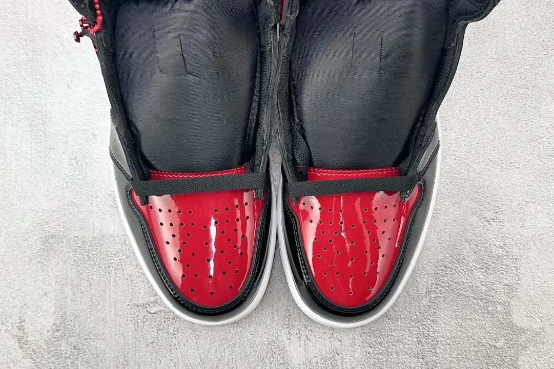 The Air Jordan 1 High Bred Patent features black and red patent leather upper with signature weaved Nike Air tongue labels. From there, a classic Wings logo on the collar and a white with red Air sole complete the retro design.