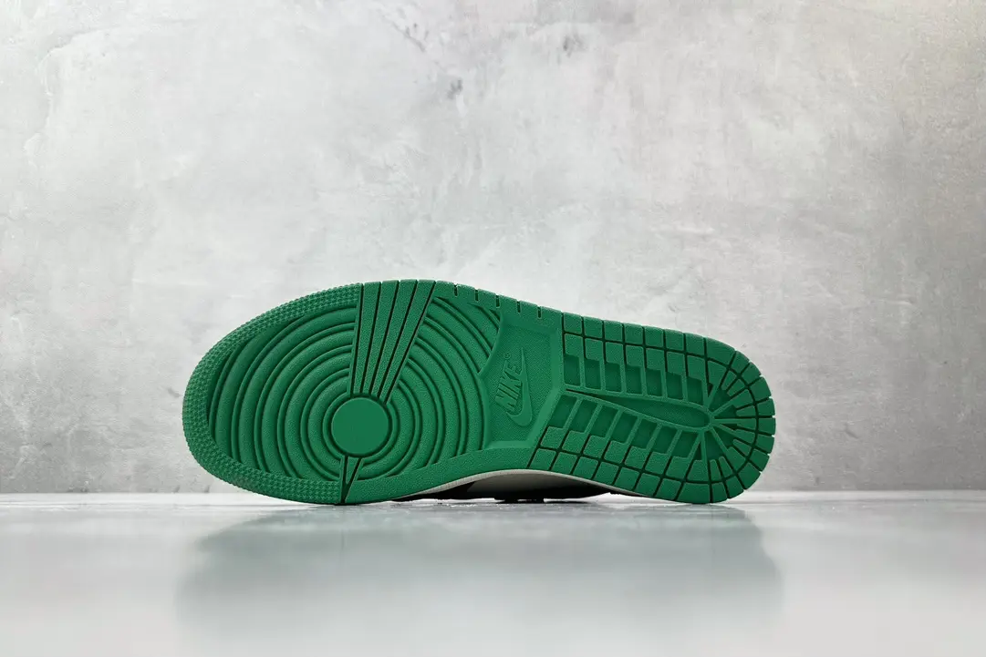 This Jordan 1 Retro High is composed of a white tumbled leather upper with pine green and black overlays. A black leather Swoosh, sail midsole, and pine green outsole completes this design.