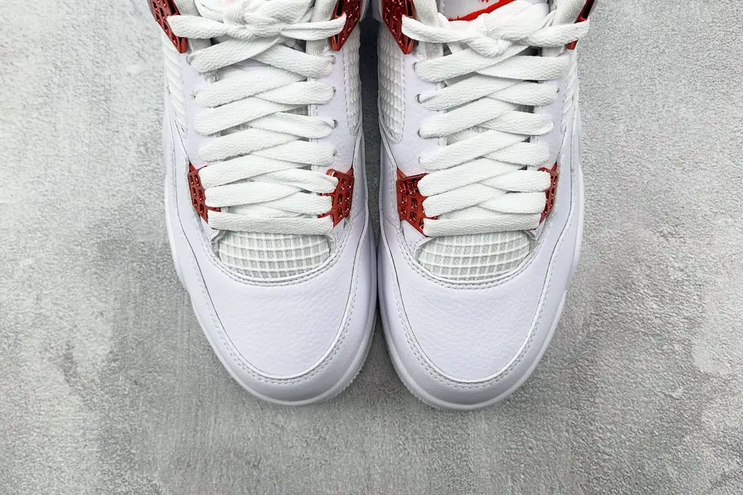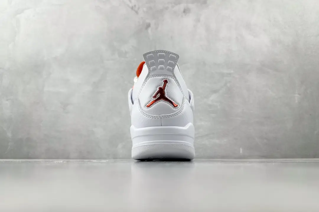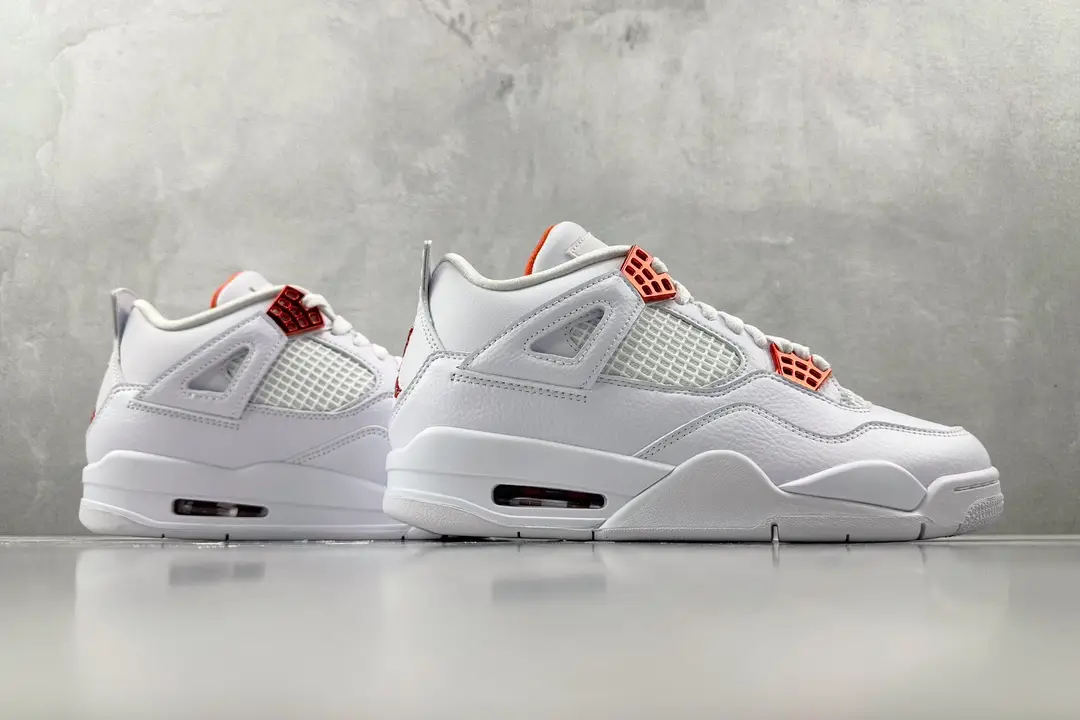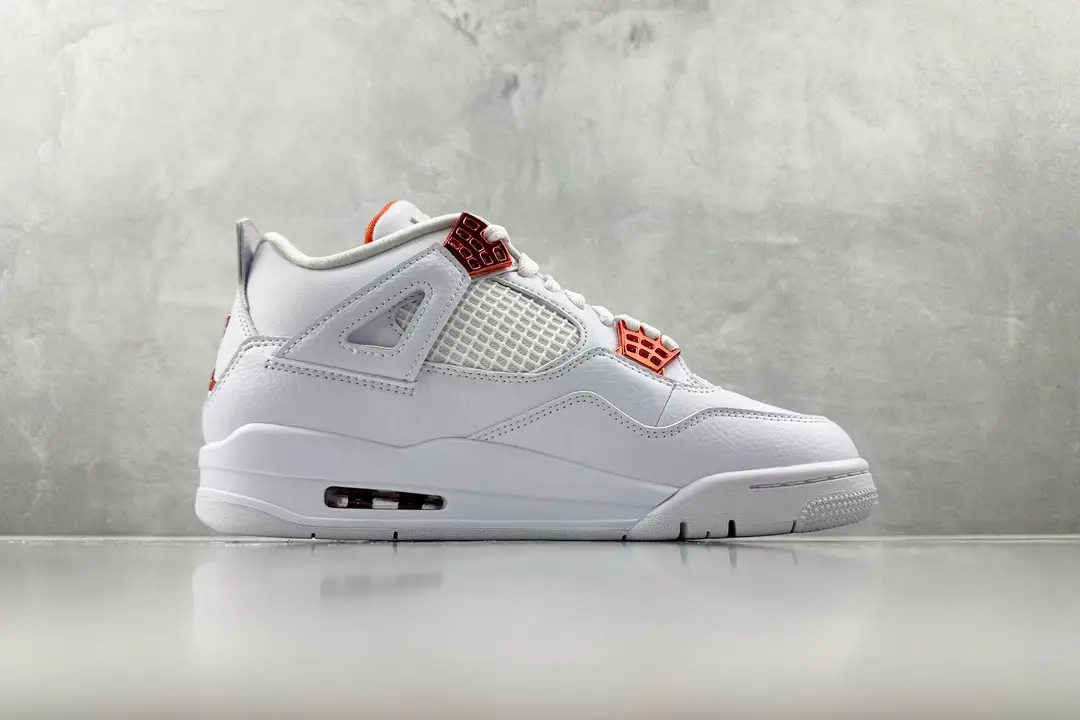 This Jordan 4 features a white leather upper with white netted underlays and Metallic Orange detailing on the upper eyelets.