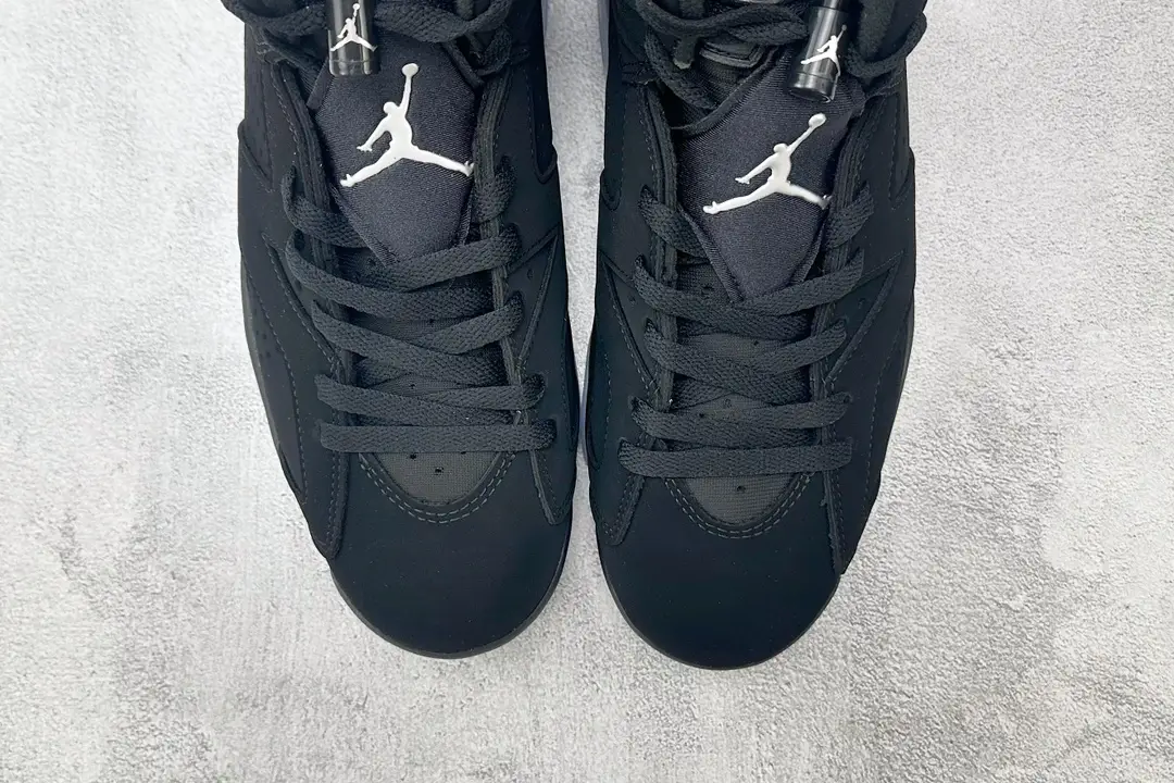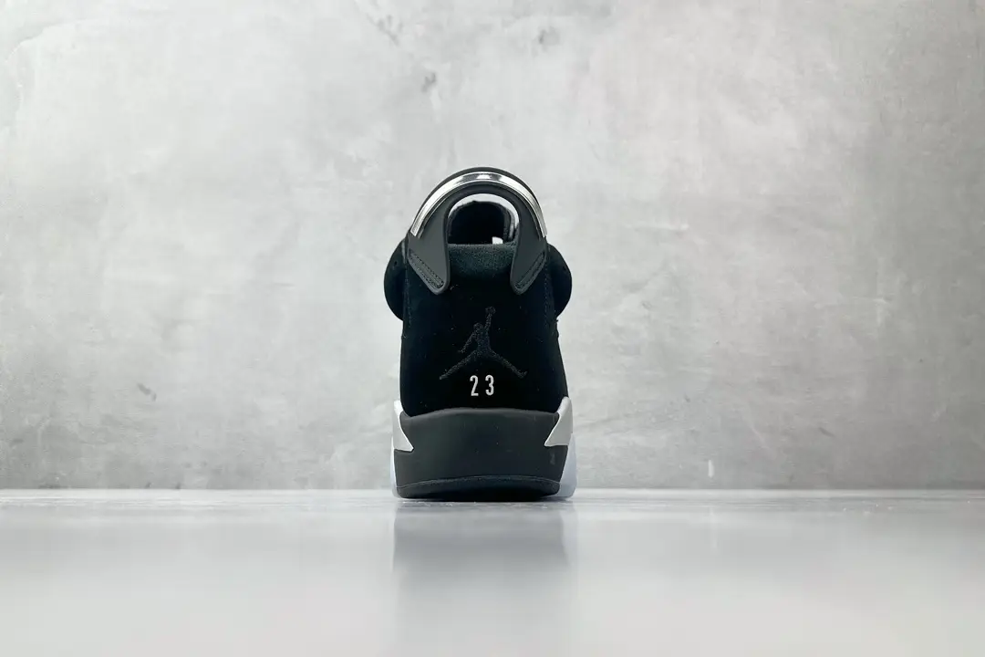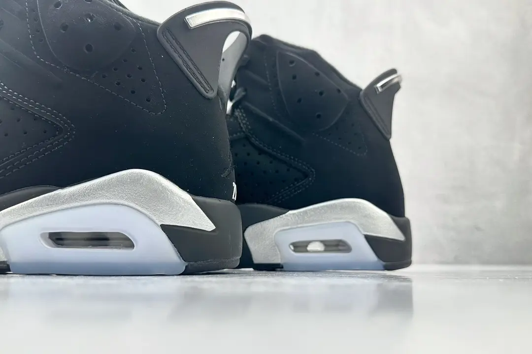 The Air Jordan 6 Retro Chrome is crafted from a tumbled leather, synthetic nubuck and synthetic textiles, with a color palette of black and metallic silver.