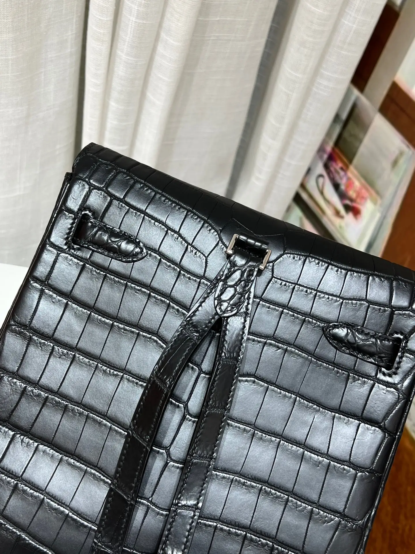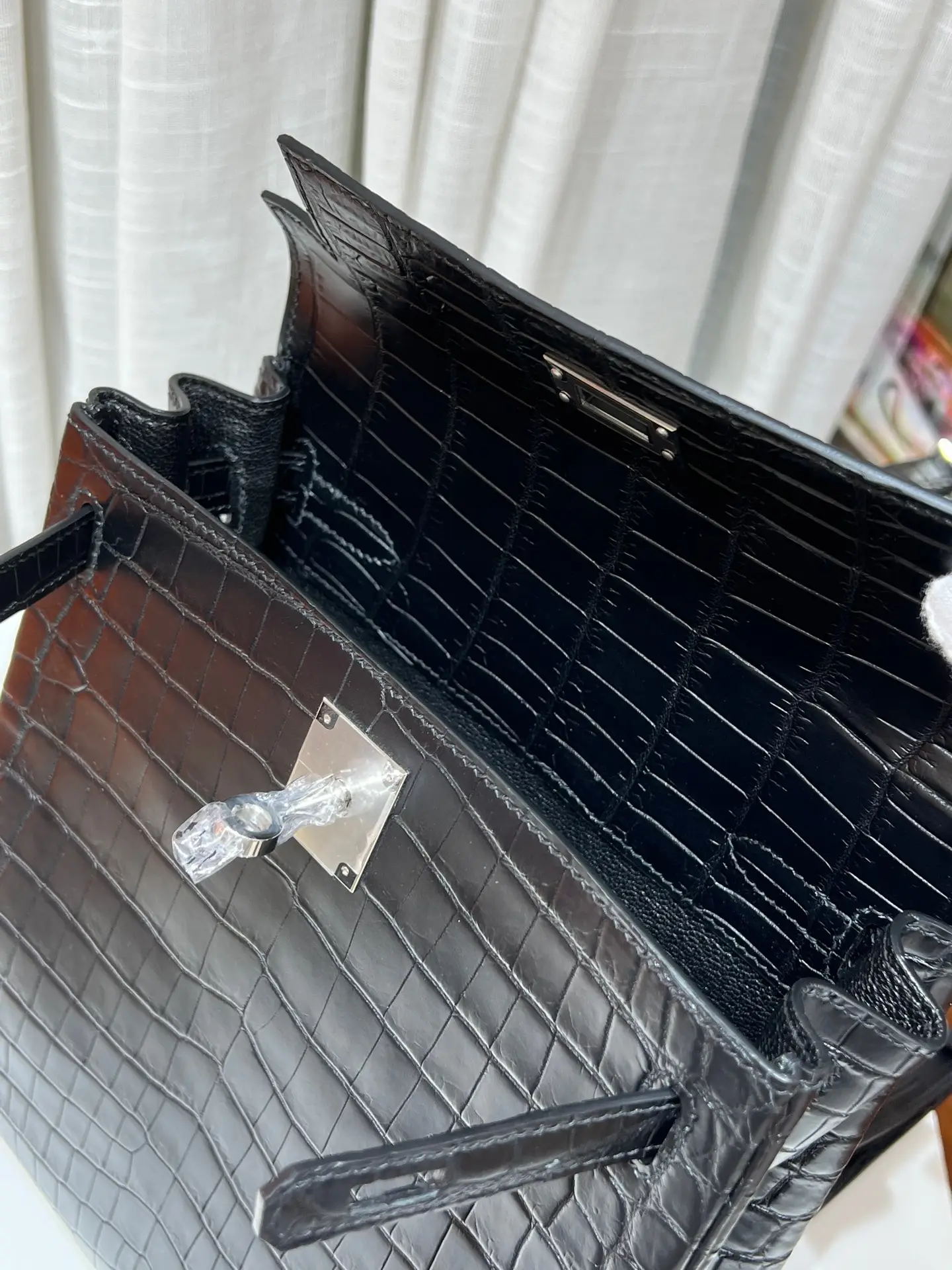 Kelly black silver buckle i Nile crocodile pure hand sewn wax thread