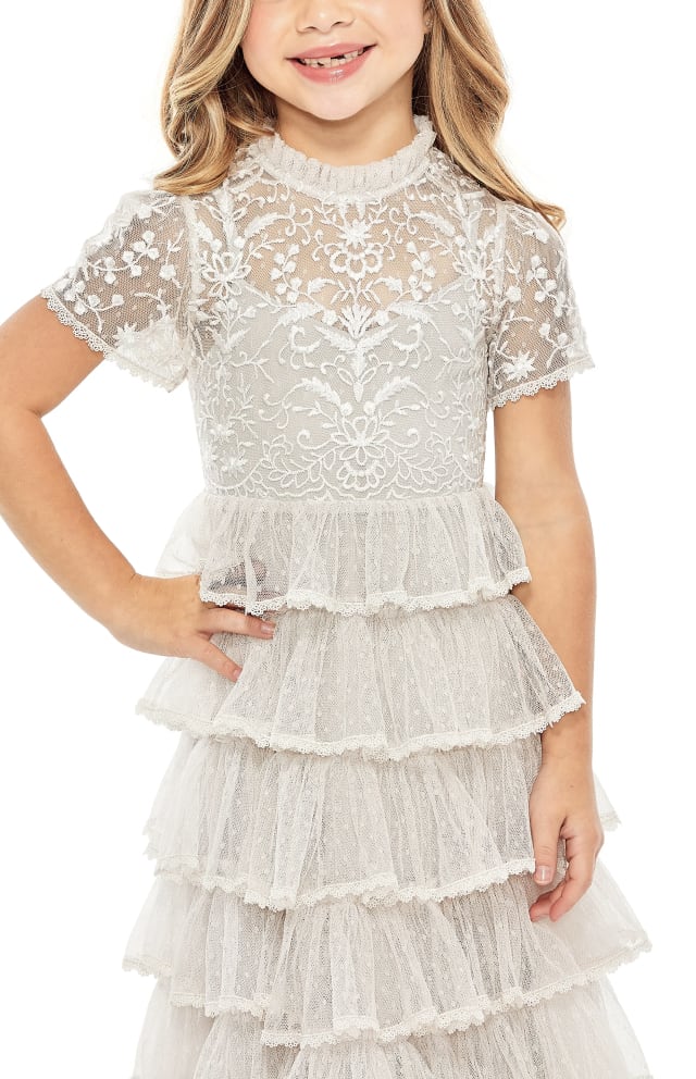 Floral embroidery details the bodice of this keepsake-worthy dress with a ruffled neck and tiered tulle skirt trimmed in scalloped lace.
