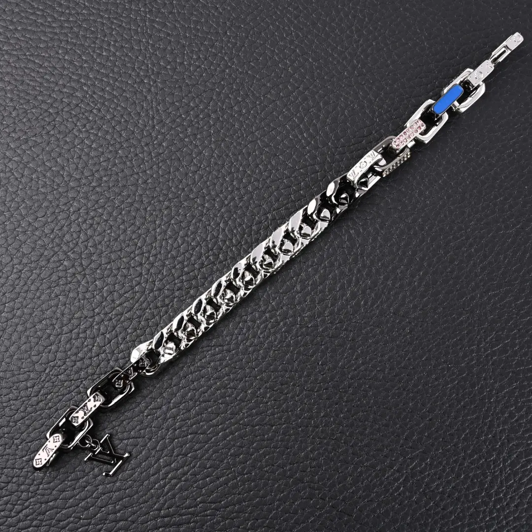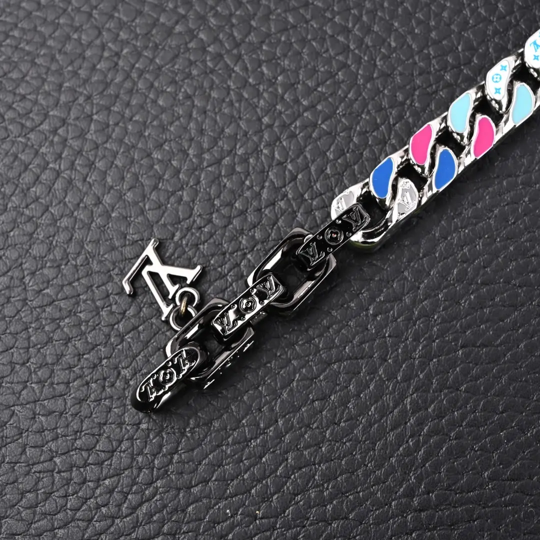 The large flat chain links release visual impact, gathering attention through inscriptions, elegant enamel, and dazzling artificial crystals, witnessing the creative spirit. Metal artificial crystal, enamel, engraved LV letter decoration, hook and buckle opening and closing.