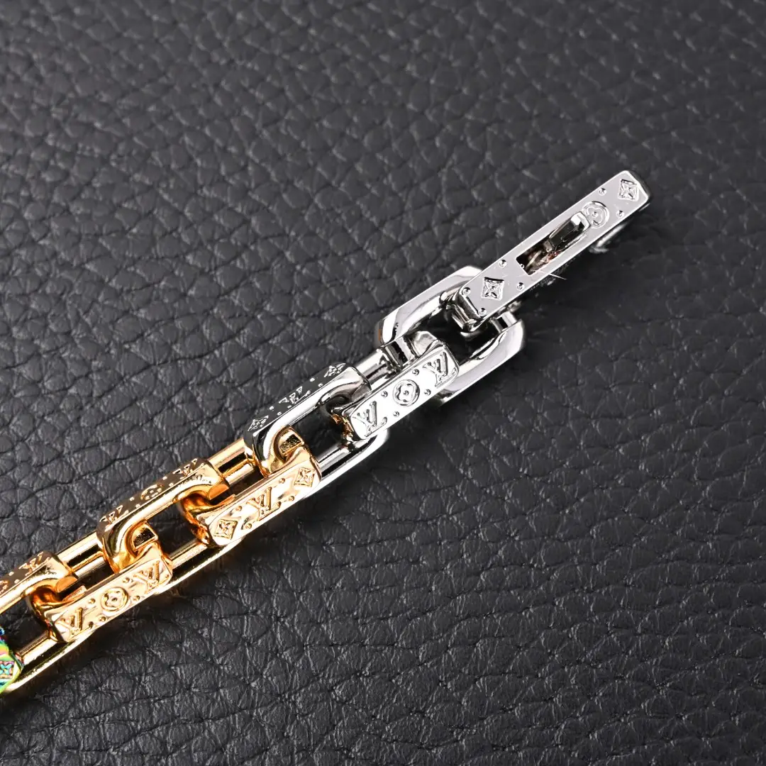 Matte, polished, and glossy metal construction creates rugged chain links, with LV letters swaying in a classic style.