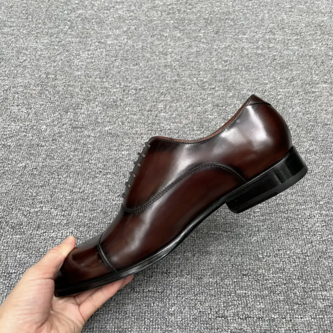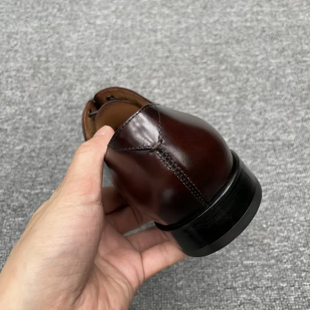 Exquisite toe cap with ultimate artistic design. The entire shoe is made of imported waxed cow cowhide, which is hand polished using ancient methods. The pores are carefully selected, and the glossiness is excellent. The texture is soft, tough, durable, and not easily deformed. The apricot colored small cowhide lining is soft, comfortable, sweat absorbing, and breathable. Genuine leather outsole, with composite rubber film at the heel and both front and rear outsoles