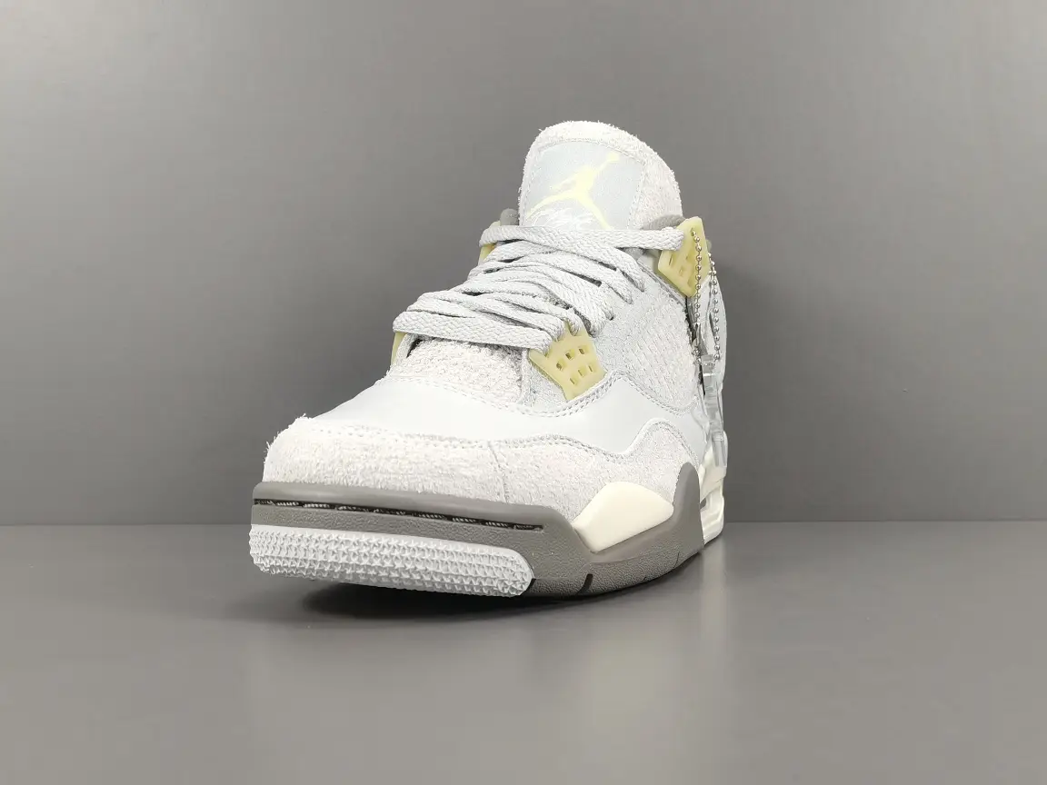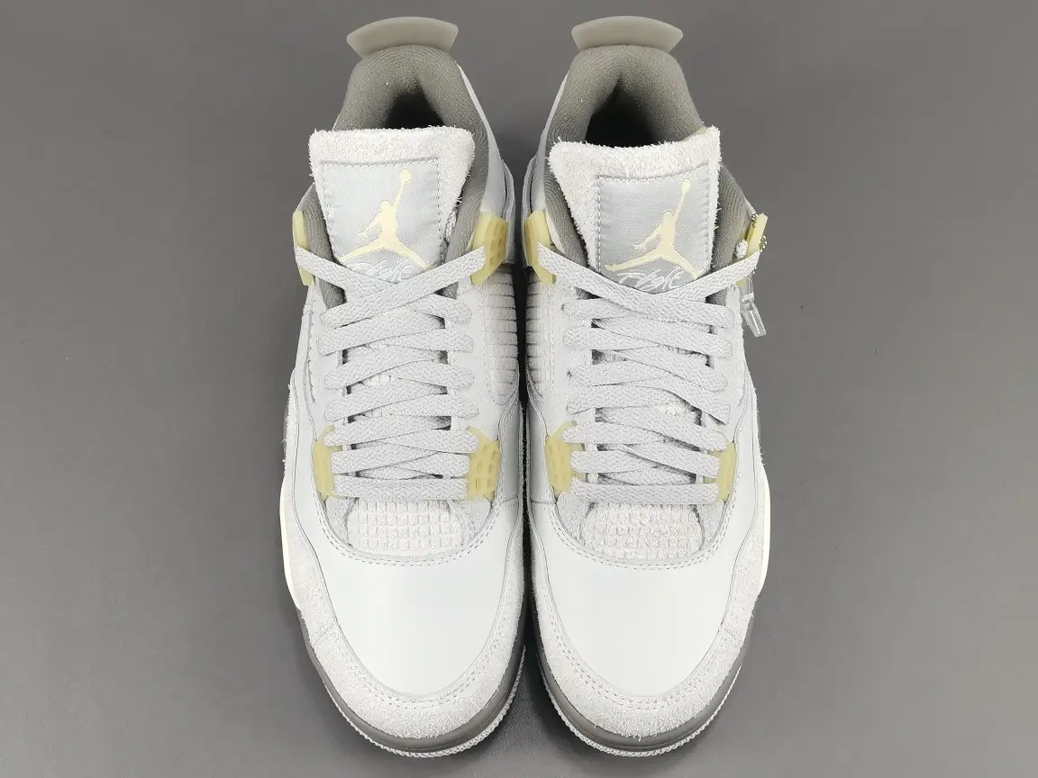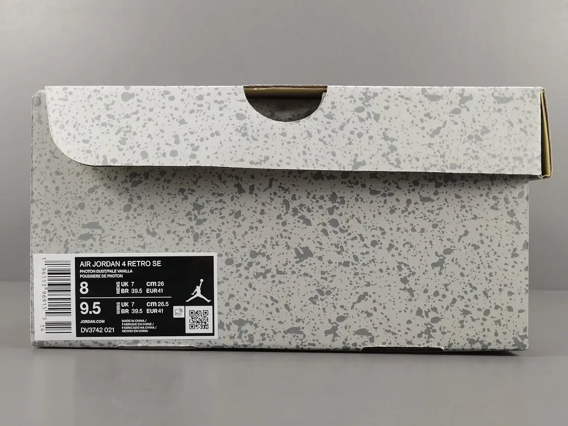 The Air Jordan 4 SE Phototon Dust is constructed with leather and suede uppers consisting of various shades of grey. Jordan Brand is changing directions with the Air Jordan 4s mesh cage and replacing it with a soft suede and a cracked leather cage wing.