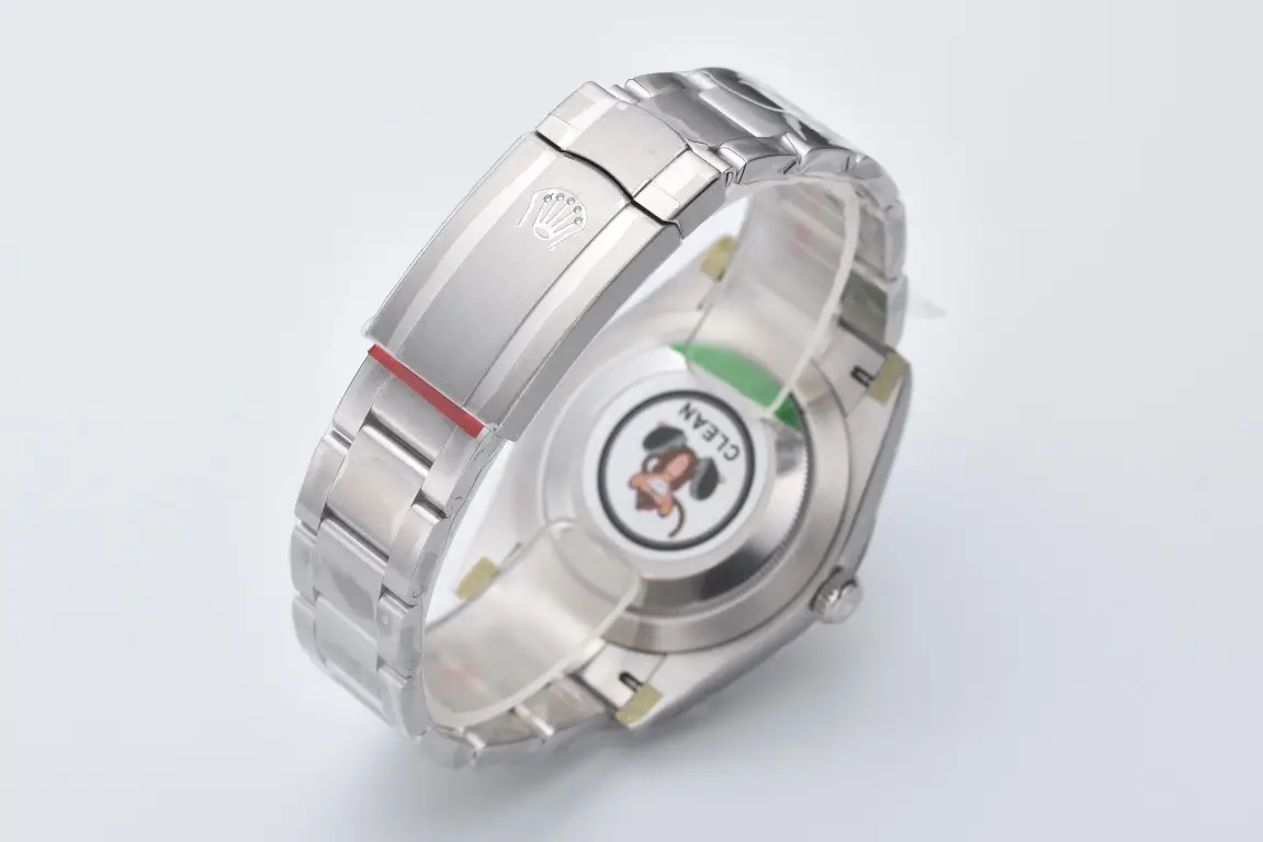 The 41mm case is built from 904L Oyster steel — the same corrosion-resistant alloy specified in authentic Rolex production — with a smooth polished domed bezel in the classic Oyster Perpetual style. The side profile reveals the characteristic graduated lug form and correct case thickness, with a screw-down winding crown at 3 o’clock carrying the Rolex coronet. The Oysterclasp is one of the most precisely replicated elements of this watch: the Rolex coronet logo is engraved in N-cut relief with a regular, uniform form and a mirror-polished inner face — confirmed against a genuine clasp in a side-by-side comparison that validates the engraving depth, letter spacing, and surface finish. The three-row Oyster bracelet alternates brushed centre links with polished outer links, integrating cleanly at the lugs. Browse our full range of fake Rolex watches across all models.