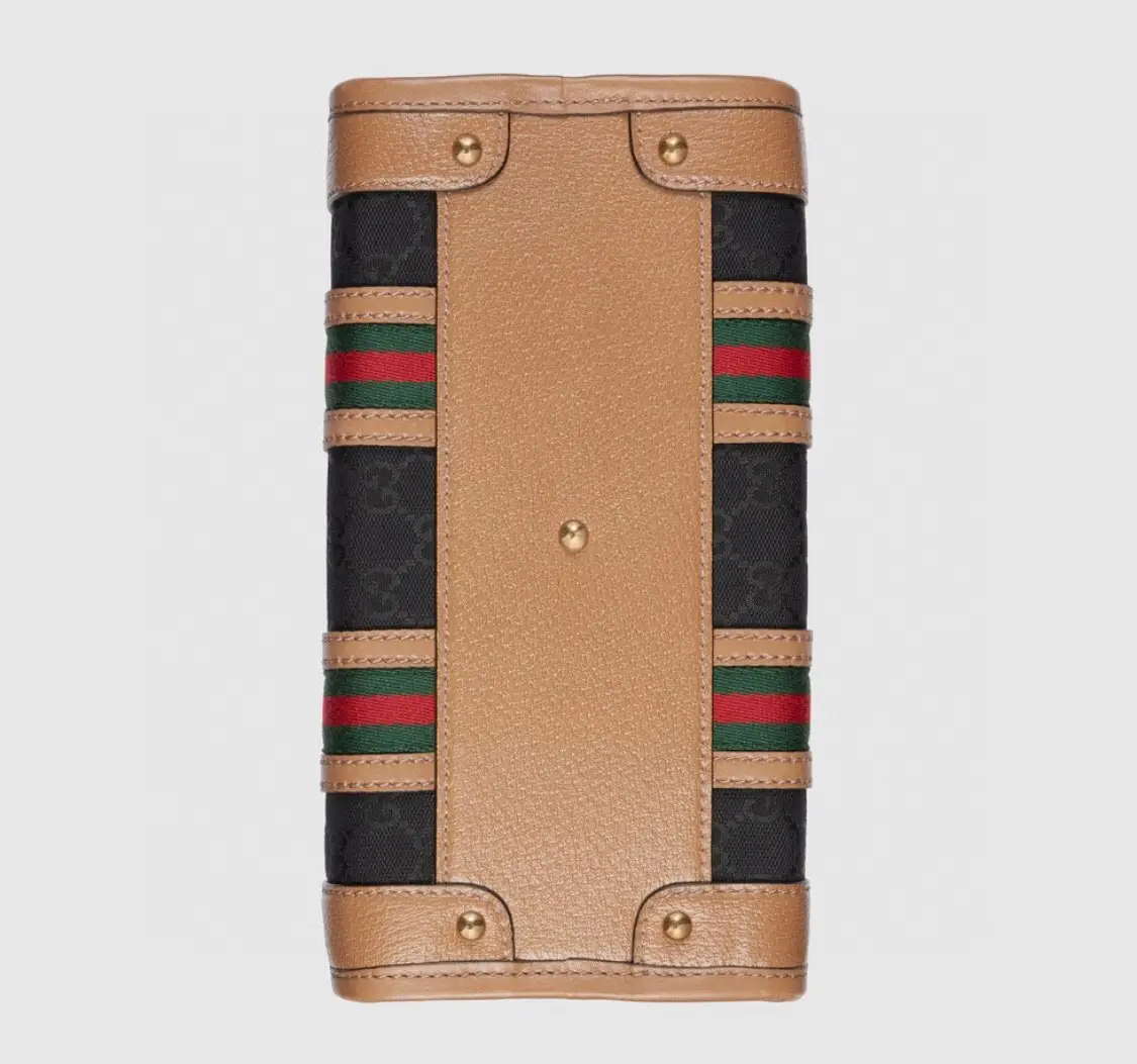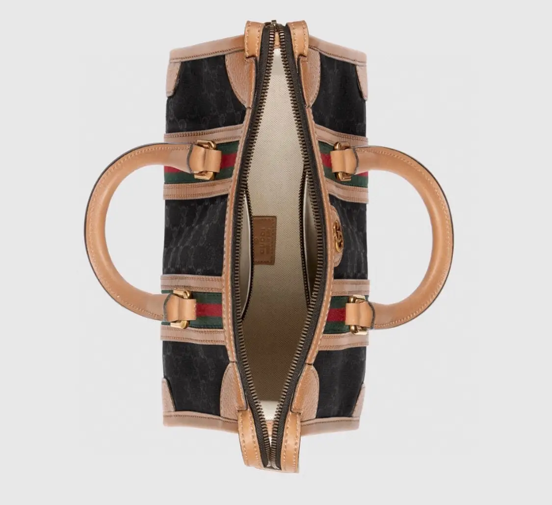 Renovate and interpret the style of travel bags. The original brown GG canvas, striped webbing, double-G accessories, and brand classic logo together interpret a unique style. Black classic GG canvas, brown leather rolled edges, gold adjustable accessories, red and green ribbon double G, detachable identity tag, embellished with detachable leather keychain, metal protective foot nail, side zipper buckle, interior: 2 zipper pockets, handle (8 cm high), detachable shoulder strap (56 cm high) zipper closure.