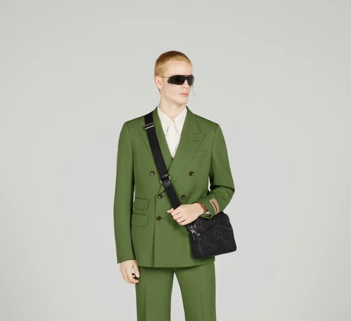 Double G grade reinterprets iconic travel bags with a fully black design. As a fresh interpretation of Mr. Guccio Gucci’s initials, GG is presented in a super large size on this mailman bag, creating a unique brand identity charm.
