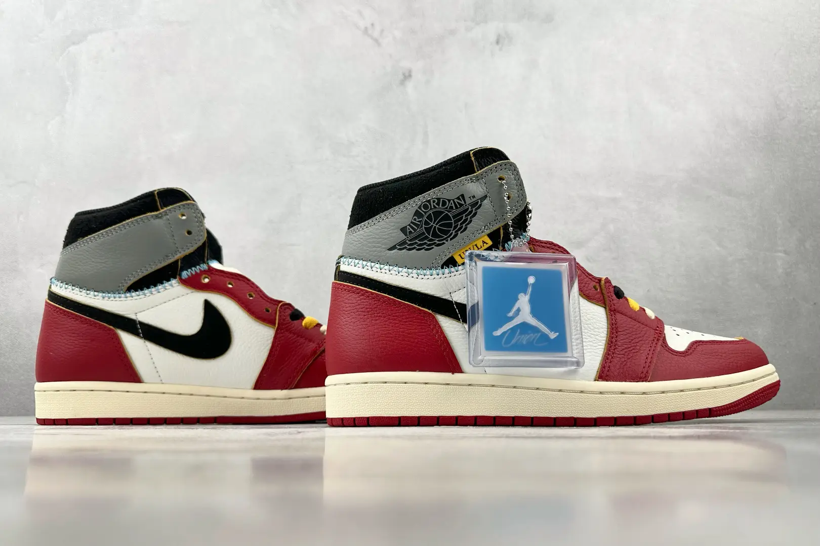 The Jordan 1 Retro High OG SP Union LA Chicago Shadow brings two legendary colorways together in a seamless blend of heritage and innovation. Union LA continues its signature design approach, merging the iconic Chicago red-and-white leather base with the Shadow grey and black ankle collar, creating a striking contrast. The transition between the two sections is accentuated by exposed University Blue stitching, a nod to the craftsmanship behind this unique fusion.