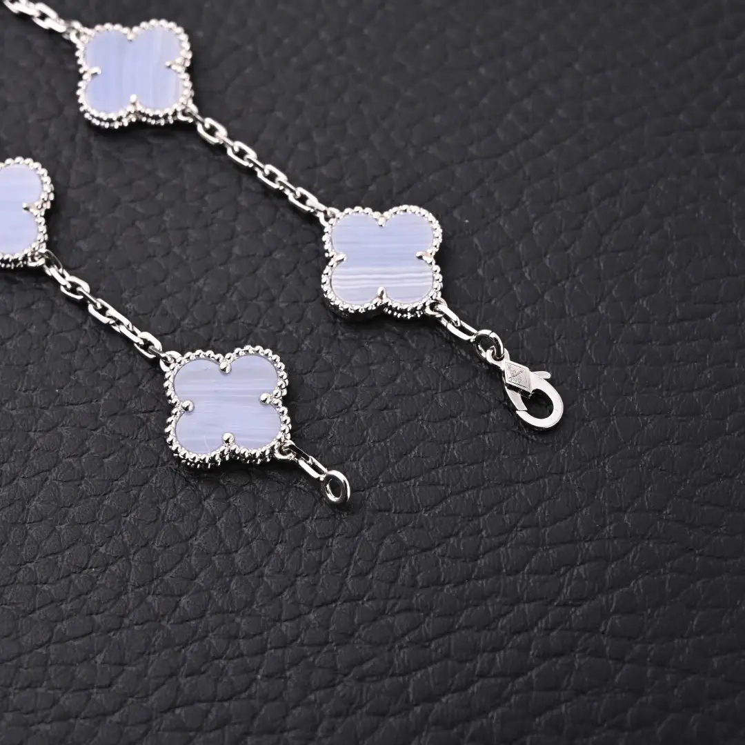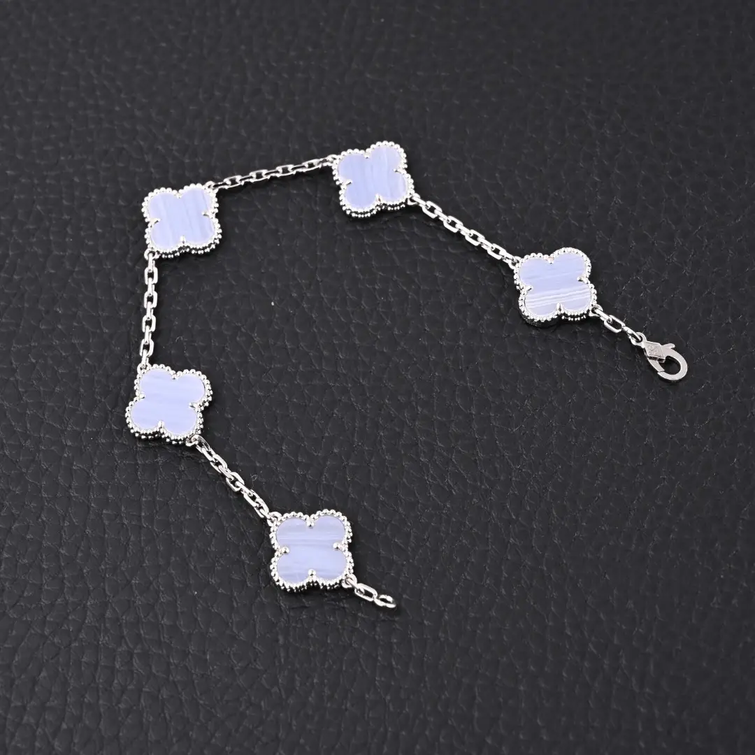 S925 silver thick plated 18K real gold! It must be thick plated with genuine gold, otherwise the perfect metallic gloss effect cannot be achieved. Customized high-end blue ceramic, with smooth four leaf petal shaped contours and beautiful lines, hand polished full small beads, strong three-dimensional sense! Lobster clasps are customized and come with exclusive anti-counterfeiting codes! Each bracelet has a unique product anti-counterfeiting code! Handmade flower chain, each chain loop has 4 sections! Perfect craftsmanship, elegant temperament! Whether worn alone or stacked, it’s beautiful!