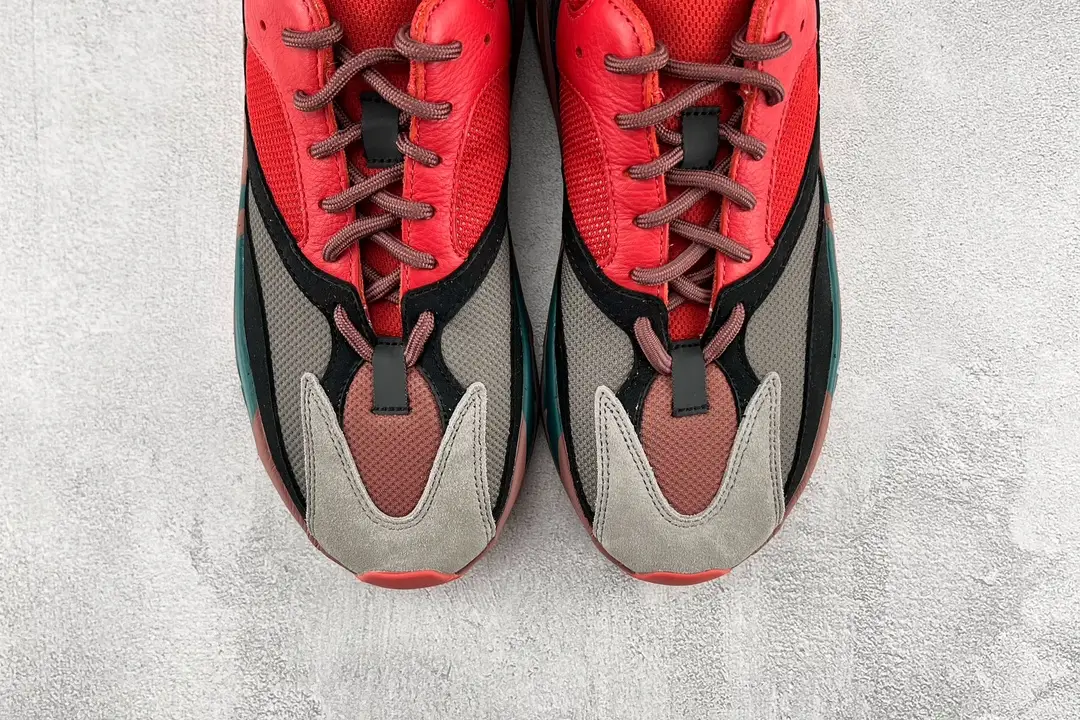 The adidas Yeezy 700 Hi-Res Red arrives with a bright red mesh and suede upper with black and grey suede overlays at the toe. In a different style from the original Yeezy 700s, the design opts for a fully circular lacing system, meaning that the ends of the laces are connected, eliminating a need for a bow on the shoe. This lacing system is similar to recent Yeezy 350s and 380s like the Onyx and Calcite Glow. At the base, a sculptural clay red Boost sole with hits of teal and bright orange provide cushioning and support.