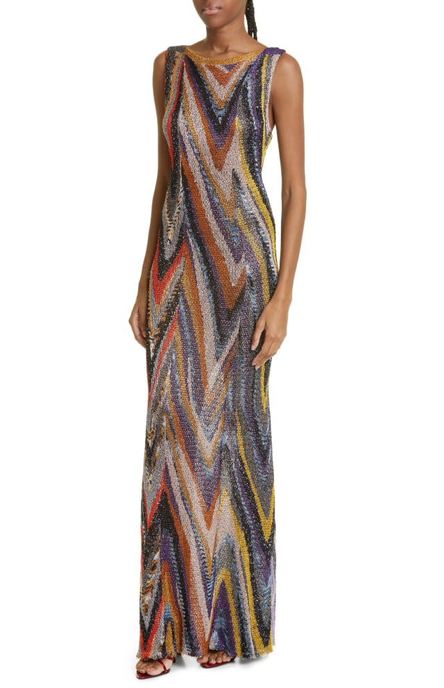 Missoni’s famed zigzag motif is set off with chic shimmer on this figure-following maxi with shoulder-baring cutaways and a thigh-high back slit.